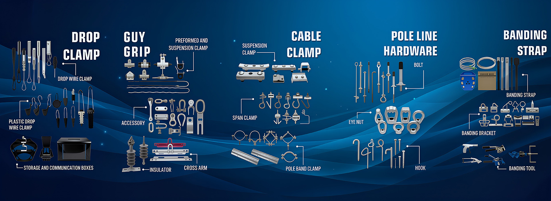 Drop Wire Clamps: Designed for securing the final drop to homes or buildings, balancing ease of installation with secure holding strength.