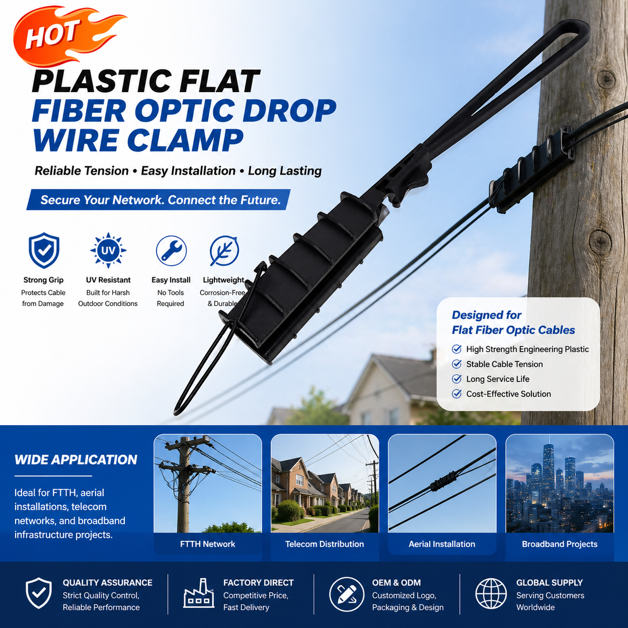 In today’s rapidly expanding telecommunications industry, reliable infrastructure is the backbone of every successful network. From FTTH (Fiber to the Home) deployments to large-scale broadband expansion projects, every component must perform consistently under real-world conditions. The Plastic Flat Fiber Optic Drop Wire Clamp is engineered to meet these demands—offering a cost-effective, durable, and efficient solution for aerial cable tensioning.